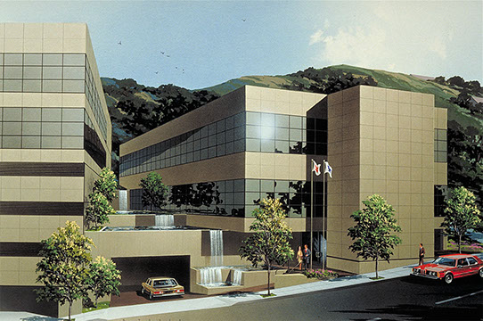 This project is actually two projects done at the same time in order to save costs. The front building, One Landmark Plaza, is a 35,000 square foot two-story office building over a 55,000 square foot three and a half level parking garage. The project cuts into a hillside lot which slopes vertically sixty feet from the street. In addition to the difficulty this site imposed, our firm was given just eight weeks to complete the design and construction documents...and obtain a building permit. If the firm had failed, the site potential would have been reduced to a three-story height limit by a then pending moratorium.