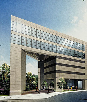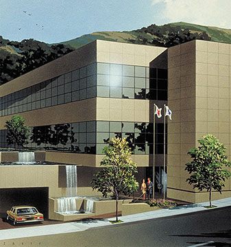 A reflecting pool and waterfall between the two buildings appears to flow from a mountain aquifer and serves to unify the two buildings in addition to offering a pleasant view to the adjacent offices.