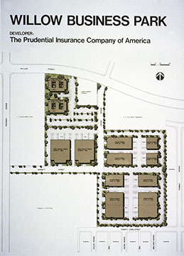 Willow Business Park is an example of some of the land planning we have done. This 36-acre development is a mix of office buildings and industrial buildings. The client desired the optimum site utilization within the constraints of the market demand. Working closely with the client and their market analysts enabled us to come up with this highly efficient plan, both economic and aesthetic.